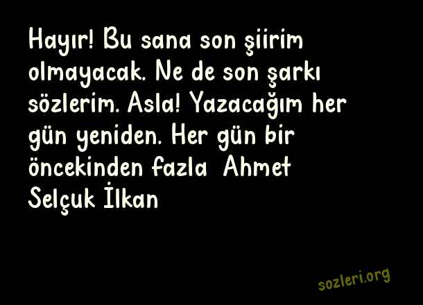 Hayır! Bu sana son şiirim olmayacak. Ne de son şarkı sözlerim. Asla! Yazacağım her gün yeniden. Her gün bir öncekinden fazla… Ahmet Selçuk İlkan ( 2023 Aşk )