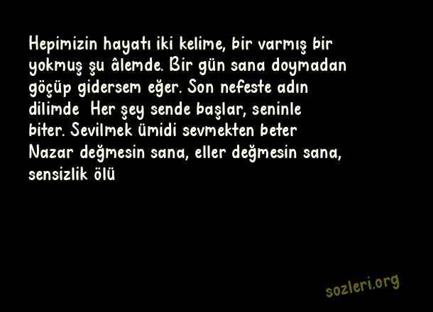 Hepimizin hayatı iki kelime, bir varmış bir yokmuş şu âlemde. Bir gün sana doymadan göçüp gidersem eğer. Son nefeste adın dilimde… Her şey sende başlar, seninle biter. Sevilmek ümidi sevmekten beter… Nazar değmesin sana, eller değmesin sana, sensizlik ölü ( Arabesk Aşk )