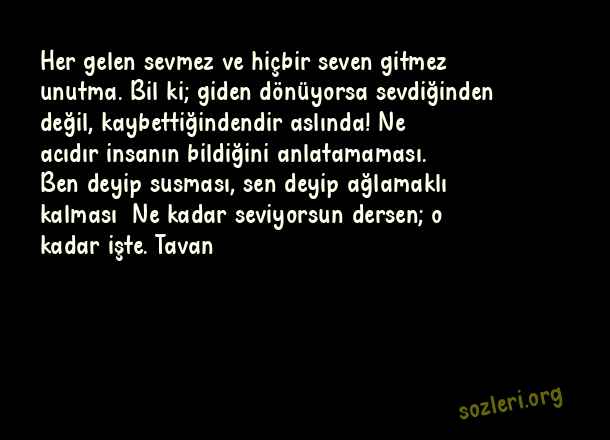 Her gelen sevmez ve hiçbir seven gitmez unutma. Bil ki; giden dönüyorsa sevdiğinden değil, kaybettiğindendir aslında! Ne acıdır insanın bildiğini anlatamaması. Ben deyip susması, sen deyip ağlamaklı kalması… Ne kadar seviyorsun dersen; o kadar işte. Tavan ( En Güzel Aşk Dolu Sözler 2023 )