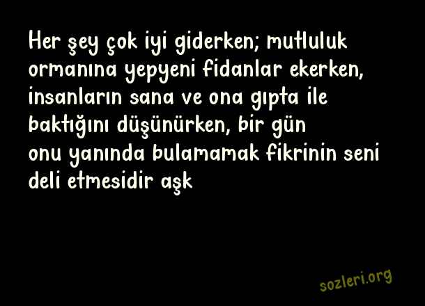 Her şey çok iyi giderken; mutluluk ormanına yepyeni fidanlar ekerken, insanların sana ve ona gıpta ile baktığını düşünürken, bir gün onu yanında bulamamak fikrinin seni deli etmesidir aşk… ( Aşk Nedir )