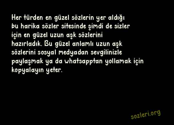 Her türden en güzel sözlerin yer aldığı bu harika sözler sitesinde şimdi de sizler için en güzel uzun aşk sözlerini hazırladık. Bu güzel anlamlı uzun aşk sözlerini sosyal medyadan sevgilinizle paylaşmak ya da whatsapptan yollamak için kopyalayın yeter. ( Uzun Aşk )