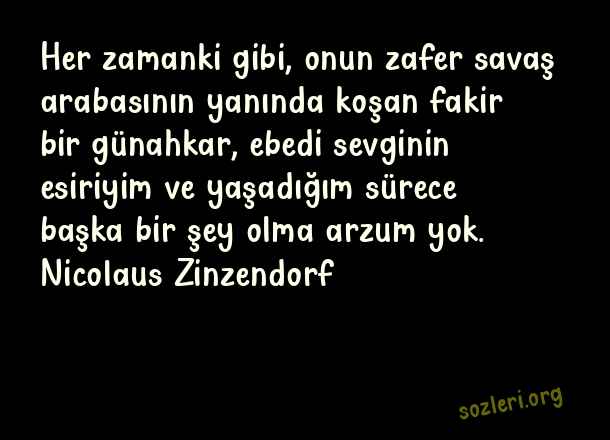 Her zamanki gibi, onun zafer savaş arabasının yanında koşan fakir bir günahkar, ebedi sevginin esiriyim ve yaşadığım sürece başka bir şey olma arzum yok. Nicolaus Zinzendorf ( Sonsuz Aşk )