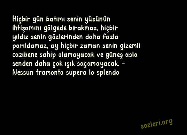 Hiçbir gün batımı senin yüzünün ihtişamını gölgede bırakmaz, hiçbir yıldız senin gözlerinden daha fazla parıldamaz, ay hiçbir zaman senin gizemli cazibene sahip olamayacak ve güneş asla senden daha çok ışık saçamayacak. – Nessun tramonto supera lo splendo ( İtalyanca Aşk )