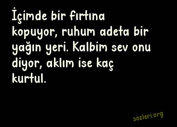 İçimde bir fırtına kopuyor, ruhum adeta bir yağın yeri. Kalbim sev onu diyor, aklım ise kaç kurtul. ( Harika Aşk )