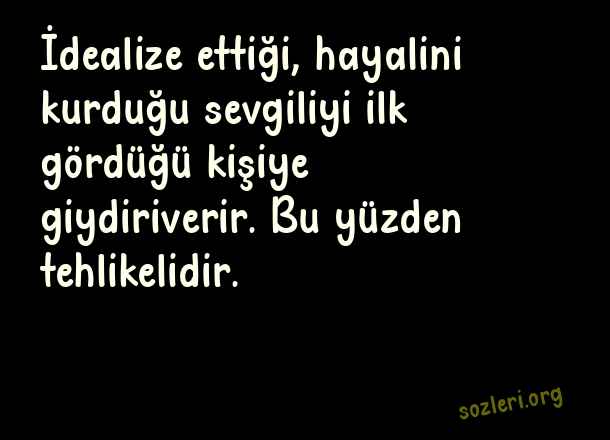 İdealize ettiği, hayalini kurduğu sevgiliyi ilk gördüğü kişiye giydiriverir. Bu yüzden tehlikelidir. ( İlk Görüşte Aşk )