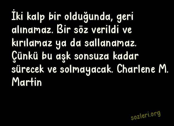 İki kalp bir olduğunda, geri alınamaz. Bir söz verildi ve kırılamaz ya da sallanamaz. Çünkü bu aşk sonsuza kadar sürecek ve solmayacak. Charlene M. Martin ( Sonsuz Aşk )
