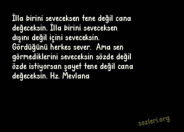 İlla birini seveceksen tene değil cana değeceksin. İlla birini seveceksen dışını değil içini seveceksin. Gördüğünü herkes sever. Ama sen görmediklerini seveceksin sözde değil özde istiyorsan şayet tene değil cana değeceksin. Hz. Mevlana ( Aşk )