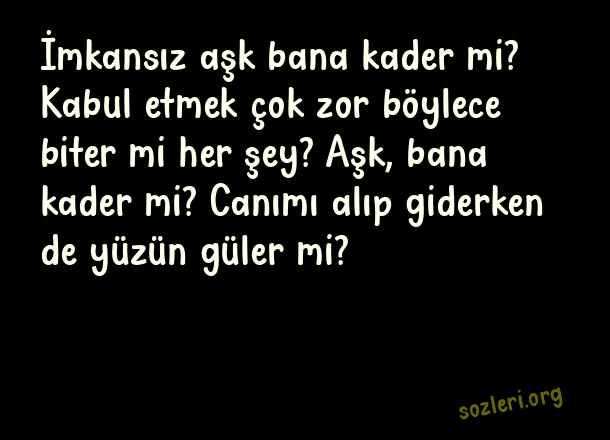 İmkansız aşk bana kader mi? Kabul etmek çok zor böylece biter mi her şey? Aşk, bana kader mi? Canımı alıp giderken de yüzün güler mi? ( İmkansız Aşk )