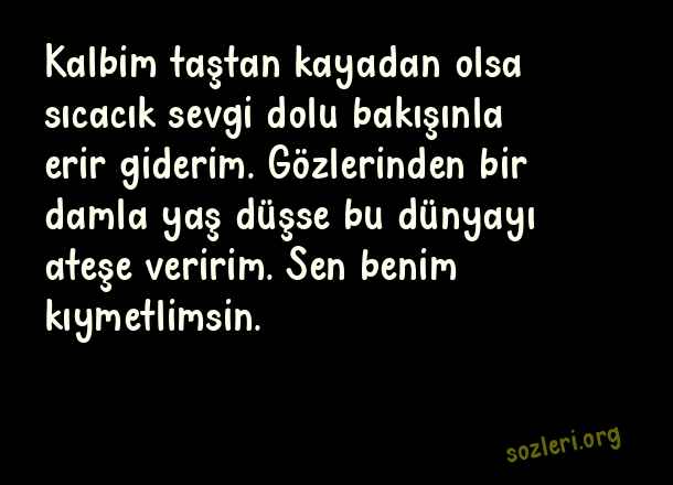 Kalbim taştan kayadan olsa sıcacık sevgi dolu bakışınla erir giderim. Gözlerinden bir damla yaş düşse bu dünyayı ateşe veririm. Sen benim kıymetlimsin. ( Aşkıma Güzel Sözler )