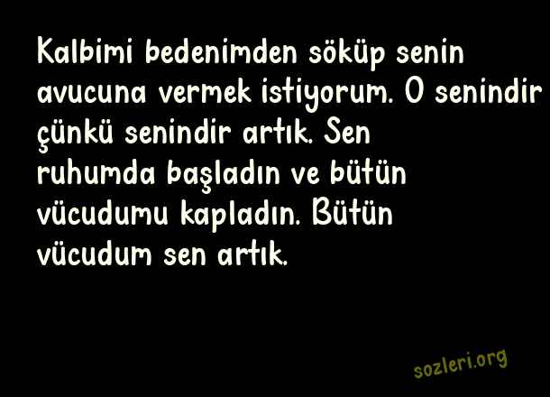 Kalbimi bedenimden söküp senin avucuna vermek istiyorum. O senindir çünkü senindir artık. Sen ruhumda başladın ve bütün vücudumu kapladın. Bütün vücudum sen artık. ( En İyi 50 Aşk Sözü )