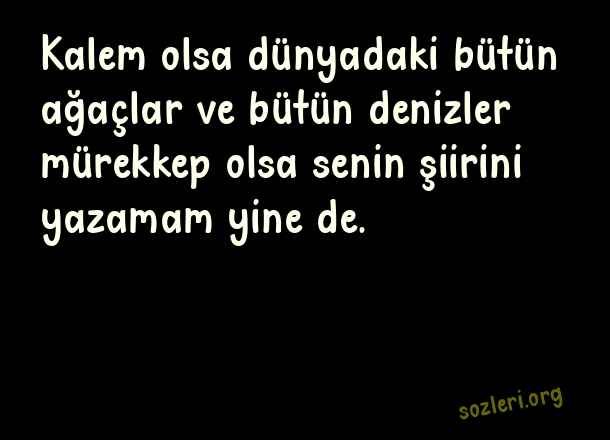Kalem olsa dünyadaki bütün ağaçlar ve bütün denizler mürekkep olsa senin şiirini yazamam yine de. ( Sevgiliye Söylenecek En Güzel Aşk )