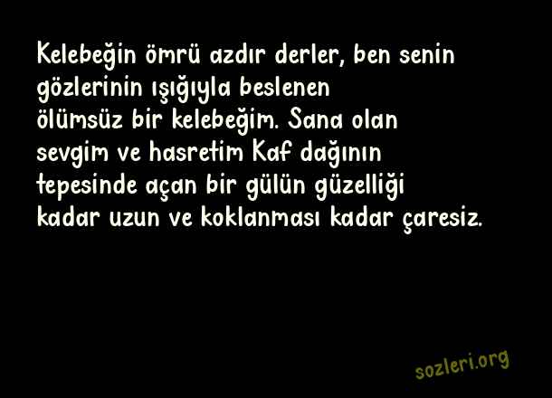 Kelebeğin ömrü azdır derler, ben senin gözlerinin ışığıyla beslenen ölümsüz bir kelebeğim. Sana olan sevgim ve hasretim Kaf dağının tepesinde açan bir gülün güzelliği kadar uzun ve koklanması kadar çaresiz. ( Aşk Sayfası )