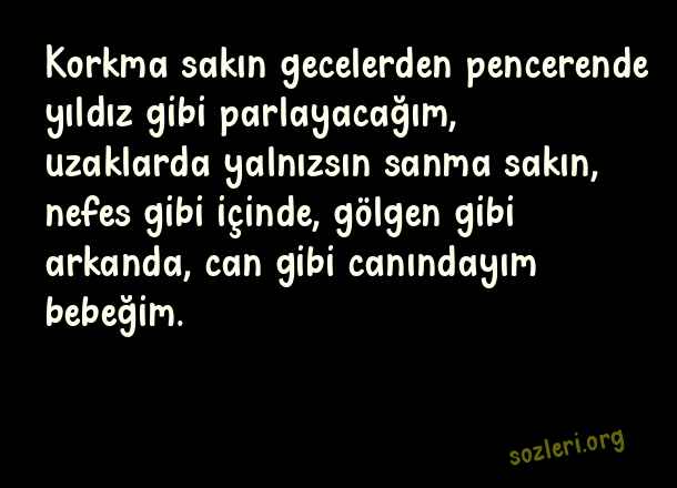 Korkma sakın gecelerden pencerende yıldız gibi parlayacağım, uzaklarda yalnızsın sanma sakın, nefes gibi içinde, gölgen gibi arkanda, can gibi canındayım bebeğim. ( Etkileyici Aşk )