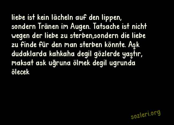 liebe ist kein lächeln auf den lippen, sondern Tränen im Augen. Tatsache ist nicht wegen der liebe zu sterben,sondern die liebe zu finde für den man sterben könnte. Aşk dudaklarda kahkaha degil gözlerde yaştır, maksat ask uğruna ölmek degil ugrunda ölecek ( Almanca Aşk )