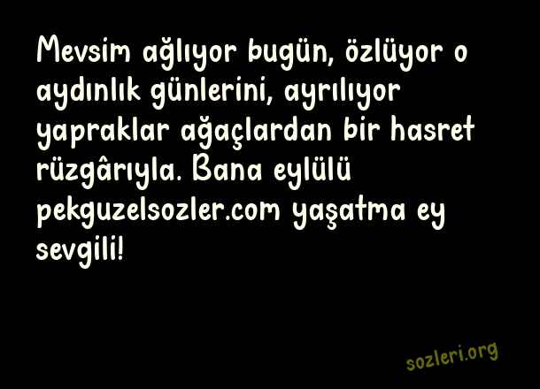 Mevsim ağlıyor bugün, özlüyor o aydınlık günlerini, ayrılıyor yapraklar ağaçlardan bir hasret rüzgârıyla. Bana eylülü yaşatma ey sevgili! ( Sevgiliye Söylenecek En Güzel Aşk )