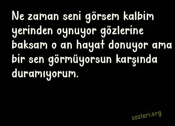 Ne zaman seni görsem kalbim yerinden oynuyor gözlerine baksam o an hayat donuyor ama bir sen görmüyorsun karşında duramıyorum. ( Platonik Aşk )