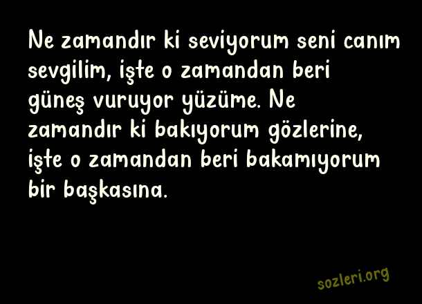 Ne zamandır ki seviyorum seni canım sevgilim, işte o zamandan beri güneş vuruyor yüzüme. Ne zamandır ki bakıyorum gözlerine, işte o zamandan beri bakamıyorum bir başkasına. ( Sevgiliye Yazılacak Aşk )