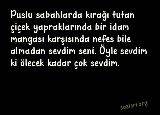 Puslu sabahlarda kırağı tutan çiçek yapraklarında bir idam mangası karşısında nefes bile almadan sevdim seni. Öyle sevdim ki ölecek kadar çok sevdim. ( Aşk )