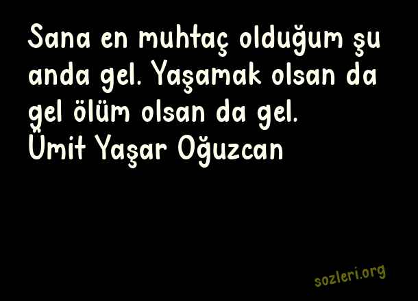 Sana en muhtaç olduğum şu anda gel. Yaşamak olsan da gel ölüm olsan da gel. Ümit Yaşar Oğuzcan ( Deli Aşk )
