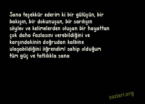 Sana teşekkür ederim ki bir gülüşün, bir bakışın, bir dokunuşun, bir sarılışın söylev ve kelimelerden oluşan bir hayattan çok daha fazlasını verebildiğini ve karşındakinin doğrudan kalbine ulaşabildiğini öğrendim! sahip olduğum tüm güç ve tatlılıkla sana ( İtalyanca Aşk )