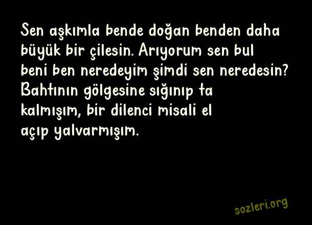 Sen aşkımla bende doğan benden daha büyük bir çilesin. Arıyorum sen bul beni ben neredeyim şimdi sen neredesin? Bahtının gölgesine sığınıp ta kalmışım, bir dilenci misali el açıp yalvarmışım. ( Arabesk Aşk )