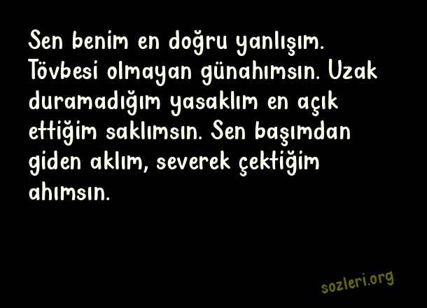 Sen benim en doğru yanlışım. Tövbesi olmayan günahımsın. Uzak duramadığım yasaklım en açık ettiğim saklımsın. Sen başımdan giden aklım, severek çektiğim ahımsın. ( Aşk )