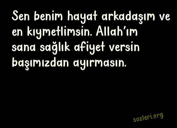 Sen benim hayat arkadaşım ve en kıymetlimsin. Allah’ım sana sağlık afiyet versin başımızdan ayırmasın. ( Aşkıma Güzel Sözler )