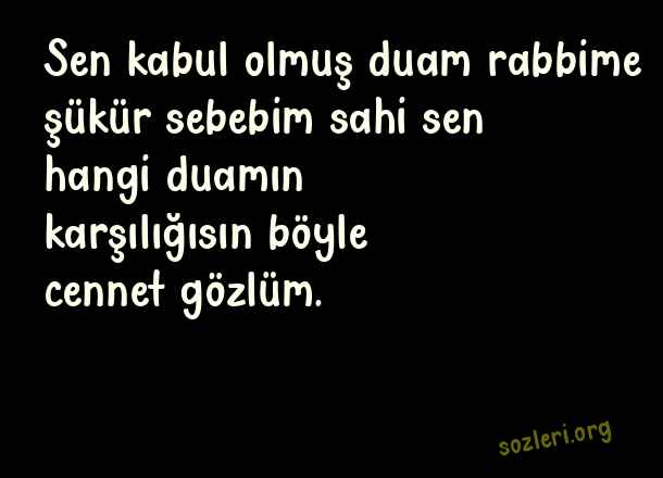 Sen kabul olmuş duam rabbime şükür sebebim sahi sen hangi duamın karşılığısın böyle cennet gözlüm. ( Eşe Aşk )
