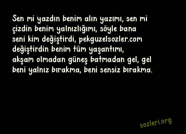 Sen mi yazdın benim alın yazımı, sen mi çizdin benim yalnızlığımı, söyle bana seni kim değiştirdi, değiştirdin benim tüm yaşantımı, akşam olmadan güneş batmadan gel, gel beni yalnız bırakma, beni sensiz bırakma. ( Etkileyici Güzel Aşk )