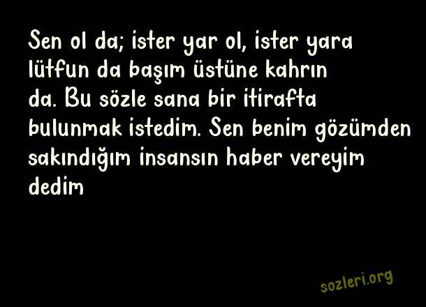 Sen ol da; ister yar ol, ister yara lütfun da başım üstüne kahrın da. Bu sözle sana bir itirafta bulunmak istedim. Sen benim gözümden sakındığım insansın haber vereyim dedim… ( Aşk İlanı )