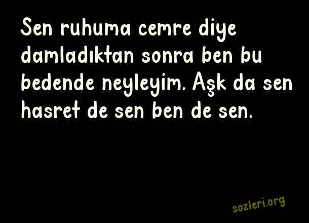 Sen ruhuma cemre diye damladıktan sonra ben bu bedende neyleyim. Aşk da sen hasret de sen ben de sen. ( Damar Aşk )