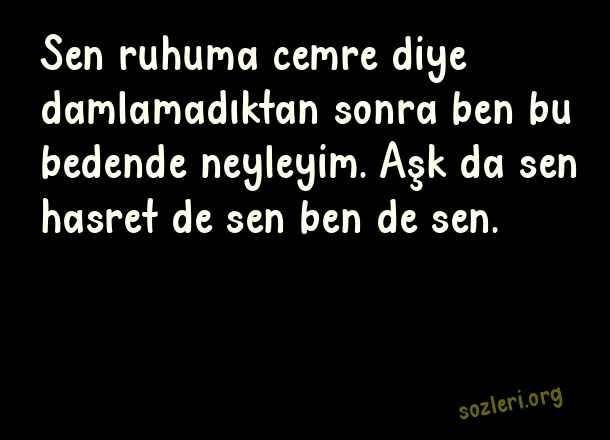 Sen ruhuma cemre diye damlamadıktan sonra ben bu bedende neyleyim. Aşk da sen hasret de sen ben de sen. ( Aşkıma Güzel Sözler )