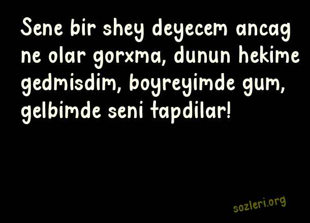 Sene bir shey deyecem ancag ne olar gorxma, dunun hekime gedmisdim, boyreyimde gum, gelbimde seni tapdilar! ( Azerice Aşk )