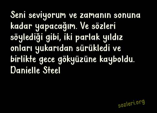 Seni seviyorum ve zamanın sonuna kadar yapacağım. Ve sözleri söylediği gibi, iki parlak yıldız onları yukarıdan sürükledi ve birlikte gece gökyüzüne kayboldu. Danielle Steel ( Sonsuz Aşk )