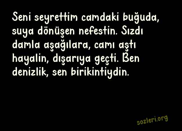 Seni seyrettim camdaki buğuda, suya dönüşen nefestin. Sızdı damla aşağılara, camı aştı hayalin, dışarıya geçti. Ben denizlik, sen birikintiydin. ( 2023 Aşk )