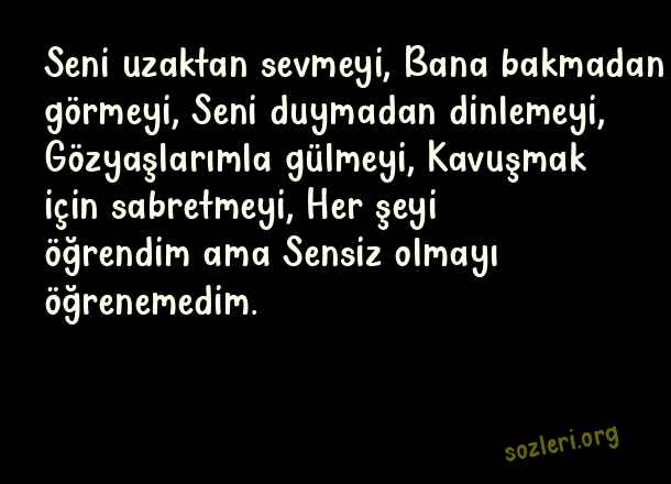 Seni uzaktan sevmeyi, Bana bakmadan görmeyi, Seni duymadan dinlemeyi, Gözyaşlarımla gülmeyi, Kavuşmak için sabretmeyi, Her şeyi öğrendim ama Sensiz olmayı öğrenemedim. ( İmkansız Aşk )