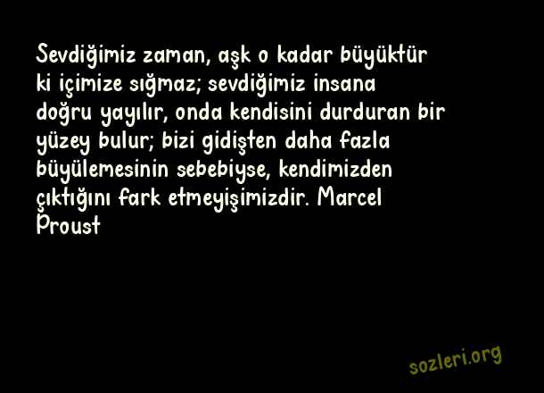 Sevdiğimiz zaman, aşk o kadar büyüktür ki içimize sığmaz; sevdiğimiz insana doğru yayılır, onda kendisini durduran bir yüzey bulur; bizi gidişten daha fazla büyülemesinin sebebiyse, kendimizden çıktığını fark etmeyişimizdir. Marcel Proust ( Yazarlardan Aşk )