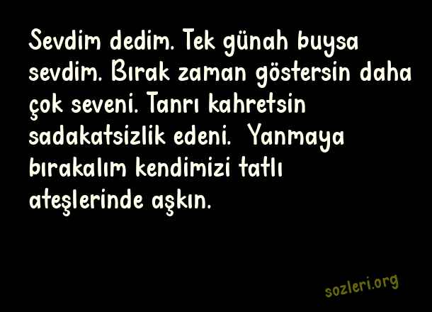 Sevdim dedim. Tek günah buysa sevdim. Bırak zaman göstersin daha çok seveni. Tanrı kahretsin sadakatsizlik edeni. Yanmaya bırakalım kendimizi tatlı ateşlerinde aşkın. ( Mükemmel Aşk )