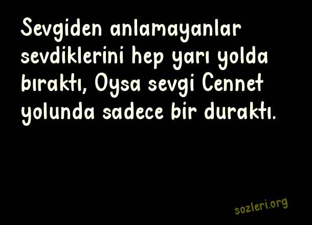 Sevgiden anlamayanlar sevdiklerini hep yarı yolda bıraktı, Oysa sevgi Cennet yolunda sadece bir duraktı. ( Helal Aşk )