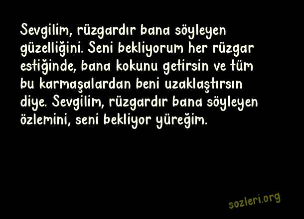 Sevgilim, rüzgardır bana söyleyen güzelliğini. Seni bekliyorum her rüzgar estiğinde, bana kokunu getirsin ve tüm bu karmaşalardan beni uzaklaştırsın diye. Sevgilim, rüzgardır bana söyleyen özlemini, seni bekliyor yüreğim. ( Sevgiliye Yazılacak Aşk )
