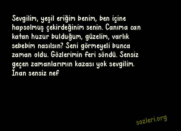 Sevgilim, yeşil eriğim benim, ben içine hapsolmuş çekirdeğinim senin. Canıma can katan huzur bulduğum, güzelim, varlık sebebim nasılsın? Seni görmeyeli bunca zaman oldu. Gözlerimin feri söndü. Sensiz geçen zamanlarımın kazası yok sevgilim. İnan sensiz nef ( Aşk Mektupları )