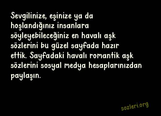 Sevgilinize, eşinize ya da hoşlandığınız insanlara söyleyebileceğiniz en havalı aşk sözlerini bu güzel sayfada hazır ettik. Sayfadaki havalı romantik aşk sözlerini sosyal medya hesaplarınızdan paylaşın. ( Havalı Aşk )