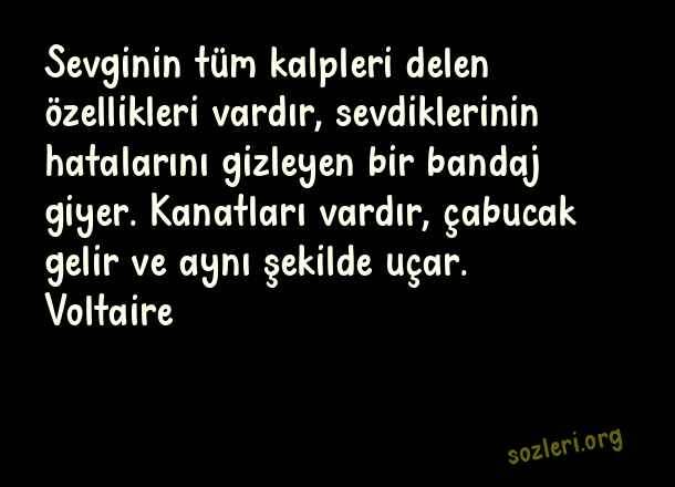 Sevginin tüm kalpleri delen özellikleri vardır, sevdiklerinin hatalarını gizleyen bir bandaj giyer. Kanatları vardır, çabucak gelir ve aynı şekilde uçar. Voltaire ( Sonsuz Aşk )