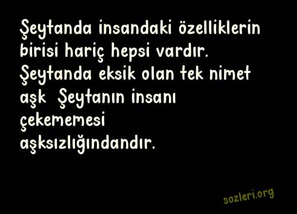 Şeytanda insandaki özelliklerin birisi hariç hepsi vardır. Şeytanda eksik olan tek nimet aşk… Şeytanın insanı çekememesi aşksızlığındandır. ( Şems Tebrizi Aşk )