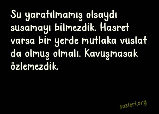 Su yaratılmamış olsaydı susamayı bilmezdik. Hasret varsa bir yerde mutlaka vuslat da olmuş olmalı. Kavuşmasak özlemezdik. ( Aşk Kısa Anlamlı Etkileyici )