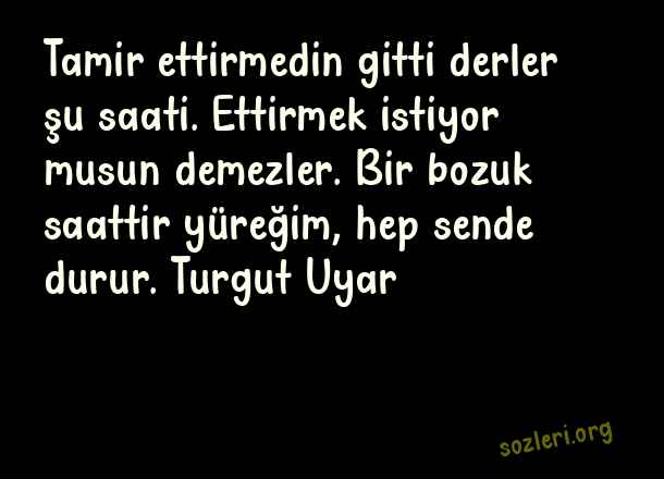 Tamir ettirmedin gitti derler şu saati. Ettirmek istiyor musun demezler. Bir bozuk saattir yüreğim, hep sende durur. Turgut Uyar ( Aşk Romanlarından Alıntılar )