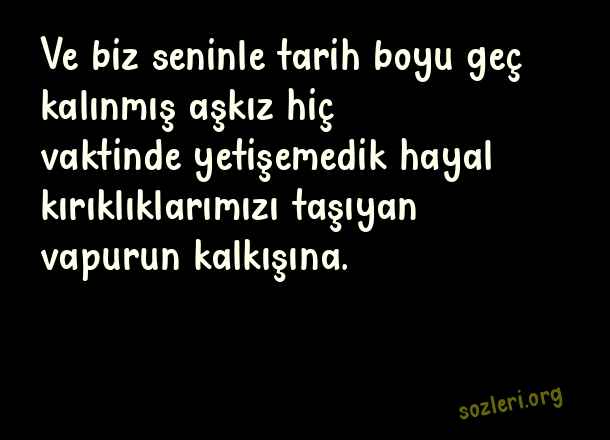 Ve biz seninle tarih boyu geç kalınmış aşkız hiç vaktinde yetişemedik hayal kırıklıklarımızı taşıyan vapurun kalkışına. ( Manalı Aşk )