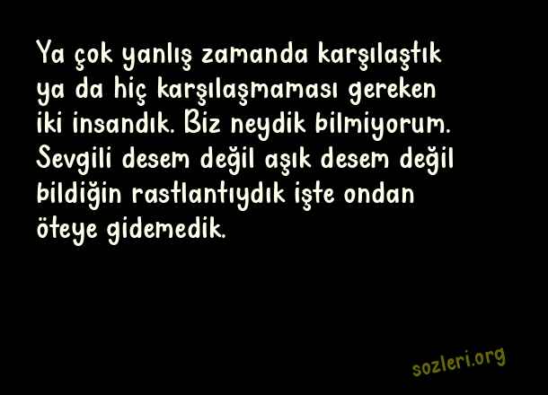 Ya çok yanlış zamanda karşılaştık ya da hiç karşılaşmaması gereken iki insandık. Biz neydik bilmiyorum. Sevgili desem değil aşık desem değil bildiğin rastlantıydık işte ondan öteye gidemedik. ( Aşk )