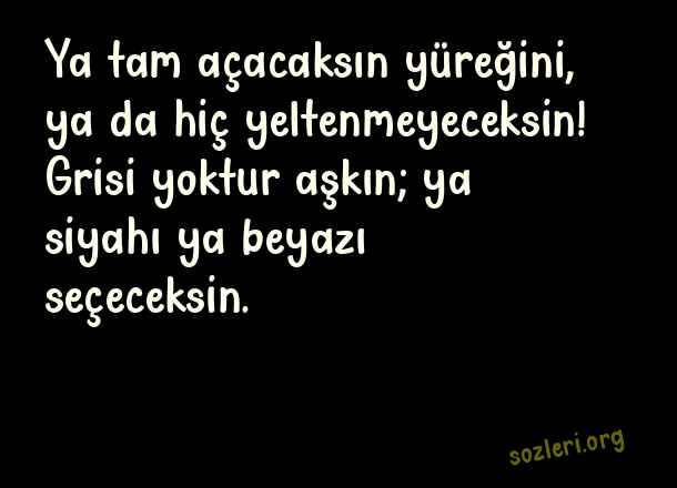 Ya tam açacaksın yüreğini, ya da hiç yeltenmeyeceksin! Grisi yoktur aşkın; ya siyahı ya beyazı seçeceksin. ( Havalı Aşk )