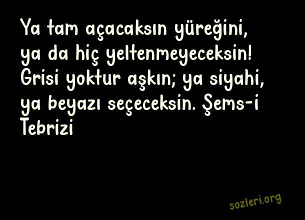 Ya tam açacaksın yüreğini, ya da hiç yeltenmeyeceksin! Grisi yoktur aşkın; ya siyahi, ya beyazı seçeceksin. Şems-i Tebrizi ( En İyi 50 Aşk Sözü )